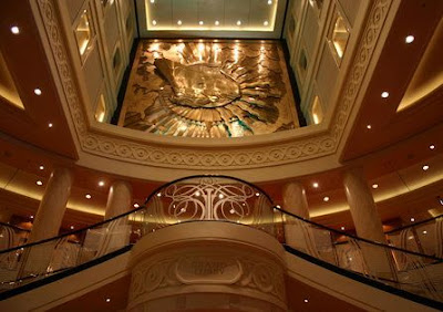The gorgeous atrium with an art deco style metal sculpture of a cruise ship breasting the waves...