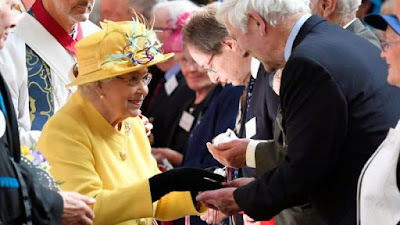 Part of the tradition is handing our pouches of coins to pensioners... one man and woman for each year of the Queen's age.