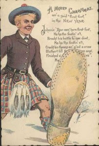 First Footing plays an important part. The First Footer refers to the first person who crosses the threshold of your house after midnight and "seals yer fate" for the coming year. The First Footer should be a tall, dark and handsome man with a "dainty foot". Until the First Footer came in the front door after midnight, no one should enter or leave. The First Footer would knock, be asked to enter and do so with gifts in his pockets which have regional variations. :
